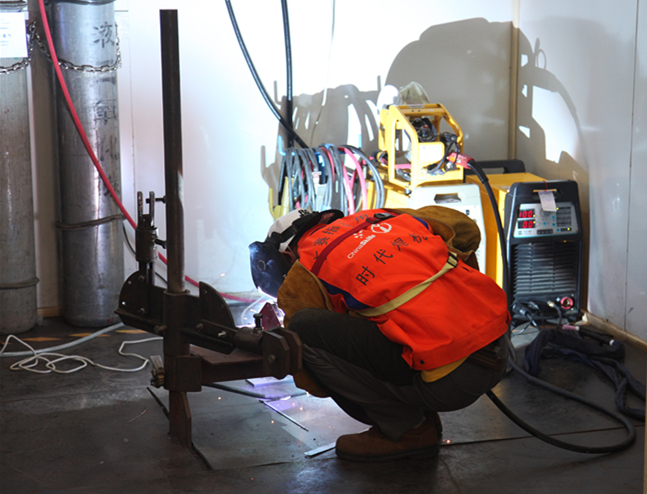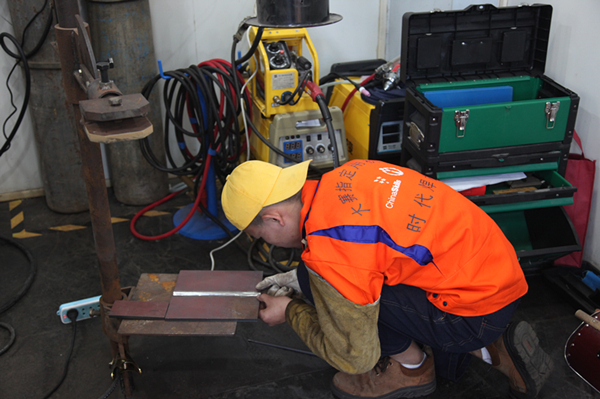 為了應對這場高手的廝殺,時代焊機早已做好充分準備。賽場中30余個工位整齊而規范的擺滿了嶄新的時代焊機。時代為大賽提供的比賽機為:直流氬弧焊機PNE61-400及半自動氣保焊機A160-350。時代的技術支持人員早在賽前就將所有設備調試和就位完畢,等待著焊接精英們的苛刻考驗。本次焊接技術競賽實操考試的題目按兩個模塊設計,模塊1題目為板類對接和T型角焊縫焊接內容,主要考核選手們操作實芯、藥芯氣保焊及手工焊條的技能。模塊2題目為填絲氬弧焊方法焊接大賽標志內容,主要考核選手們氬弧焊接的技藝水平。在時代焊接設備的有力支持下,選手們都順利而圓滿地完成了各個規定賽題。從5月7日一早開始,時代焊機就開足馬力持續運轉,經歷了一天的使用,焊機一直發揮正常,焊接過程中沒有出現任何瑕疵。時代的幾名服務人員一直守候在賽場,隨時聽候選手和裁判的調遣。