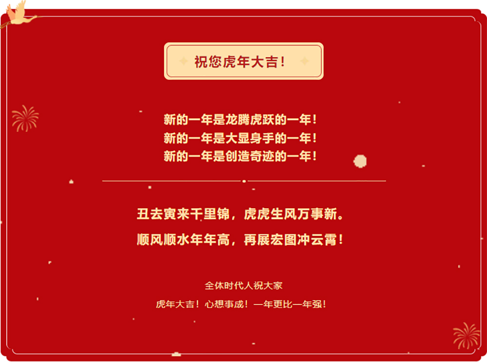 我們懷著熱切的渴望迎接虎虎生風的新的一年。新年的發展藍圖已經鋪開,全體時代人將躍躍欲試奔赴新的征程!新的戰場!
