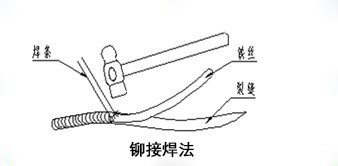 有些裂紋較寬或砂眼、氣孔直徑較大時,采用錘擊捻壓法有困難,可先用合適的鐵絲或焊條頭將裂紋或孔洞先鉚住,以減少外漏的壓力和流量,然后再快速焊。有些裂紋的周邊不規則時,可采用破布、薄木片、竹片塞進去再快速焊。注意的要點是一次只能先堵塞一段,然后快速焊,堵塞一段焊一段。