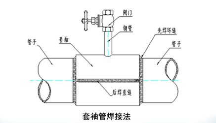 管道因磨損泄漏的面積較大時,用一段同徑或正好包住泄漏管徑的管子,長短尺寸視泄漏處的面積而定。把用來做套袖的管子對稱切割成兩半,焊上一個導流管,具體焊法與導流焊接法相同。在焊接順序上應先焊接管子與套袖的環縫,最后焊接套袖的焊縫。
