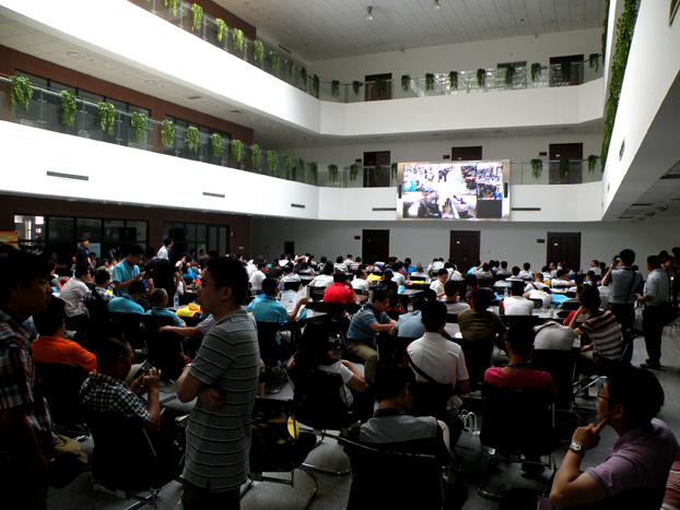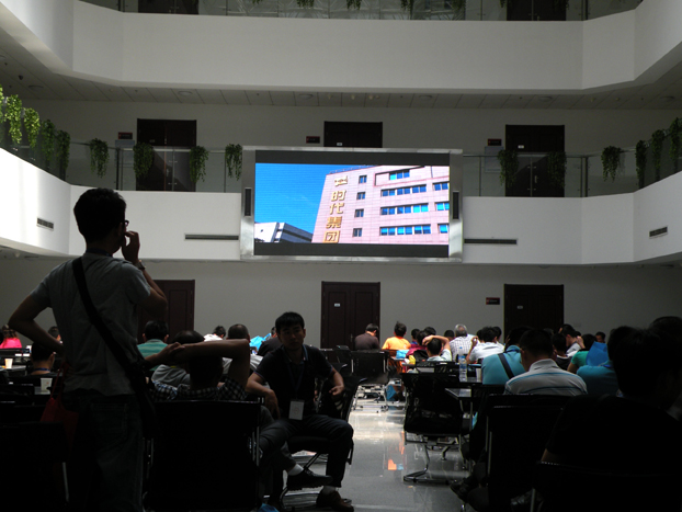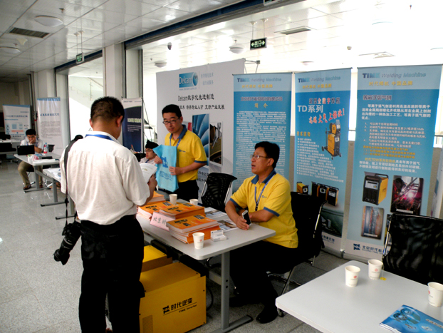 比賽期間所有參賽的領隊、教練和參賽單位領導都被安排在學院圖文中心二層的大休息廳通過大屏幕觀看賽場動態。比賽組委會只是在上午10點和下午3點安排大家去實地賽場觀摩。這種方式和往年相比有所不同。所以圖文中心二層成為參賽隊交流和溝通的唯一場所。廠家的展示區也恰巧設在這里,我們可以很方便地與參賽院校領導零距離接觸。時代焊機的展位被安排在休憩區前排。為了做好比賽展示活動,公司提前準備了三套TD系列比武用機分別是:PNE30-315ADP、TDN 3500、TDW 4000。還準備了相關樣本資料和簽到用具。參加展示活動的三位時代同仁統一穿著時代工服,給人以整齊專業的印象。時代展示區的后面用四套易拉寶展具組成展墻,介紹時代概貌和公司各類新產品、新工藝。開賽的第一天,不時有參賽單位老師來時代展臺索要資料和咨詢技術。他們中的大部分人都是時代焊機的用戶。不少老師對時代產品的現狀和未來服務方式十分關心,還有的詢問明年焊接大賽的籌備情況,有些老師還和我們一起回顧往屆賽事的趣聞和花絮,溝通氣氛十分融洽。也有一些院校有采購焊接設備的意向,前來洽商具體商務問題。對此我們都一一作答。參賽單位對時代的認知度十分高。本屆沒有焊接比賽項目,但時代焊機依然來津展示,為此參賽單位對時代的做法表示贊賞。