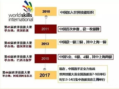 2017年10月,第44屆世界技能大賽將在阿聯酋阿布扎比舉行,中國代表隊擬參賽項目共45個。2016年7月至9月,第44屆世界技能大賽全國選拔賽全面拉開帷幕。8月13日至14日,將在上海世博展覽館1號館舉行全國選拔賽集中選拔賽!