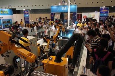 時(shí)代展區(qū)按展品的類型分為時(shí)代弧焊機(jī)器人設(shè)備、TD系列全數(shù)字焊機(jī)、焊接培訓(xùn)模擬儀、焊接材料等四個(gè)主題,還提供了技師演示、咨詢接待、微信互動(dòng)等服務(wù)。其中,焊接機(jī)器人、微信互動(dòng)獨(dú)具魅力。時(shí)代微信打印機(jī)為觀眾定格美麗,時(shí)代機(jī)器人以其優(yōu)質(zhì)精良的焊縫和精準(zhǔn)高效的焊接動(dòng)作折服了現(xiàn)場(chǎng)觀眾,令不少青年人躍躍欲試親自操控機(jī)器人動(dòng)作。焊接培訓(xùn)模擬儀也令人印象頗深。觀眾們紛紛參與演示活動(dòng),通過(guò)VR眼鏡體驗(yàn)3D立體焊接畫(huà)面,實(shí)時(shí)觀測(cè)焊槍與焊接空間的距離,模擬真實(shí)的焊槍手感,同步立體顯示操作動(dòng)作。